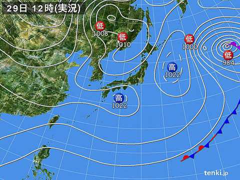 | 晴れ。東の風、白雲より上空は北西。天気図(tenki_jp) | |||||