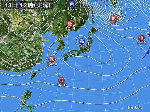 | 薄日のちドン曇り、無風から一時北東のちフォロー。一瞬の東微風で、一機がブッ飛び。天気図(tenki_jp) | |||||